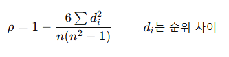 - 두 변수 간 비선형적인 관계를 측정하거나 연속형 데이터가 아닌 순위 데이터(서열척도)에 사용