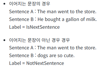 - 두 개의 문장이 이어지는 문장인지 아닌지 맞추는 방식으로 훈련