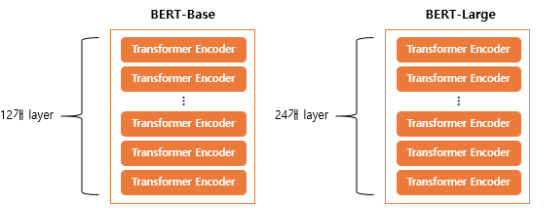 - BERT의 기본구조는 Transformer의 Encoder를 쌓아올린 구조로 Base버전에는 총 12개, Large버전에는 24개를 쌓음