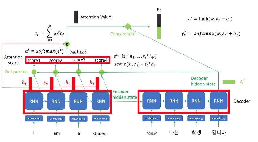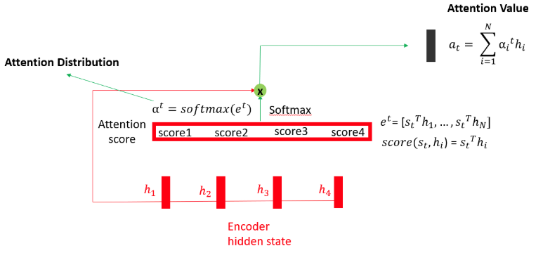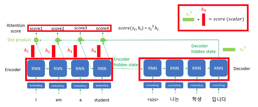 - Attention Score는 RNN의 수 만큼 나오고 위 그림은 score1~score4까지 4개가 나옴